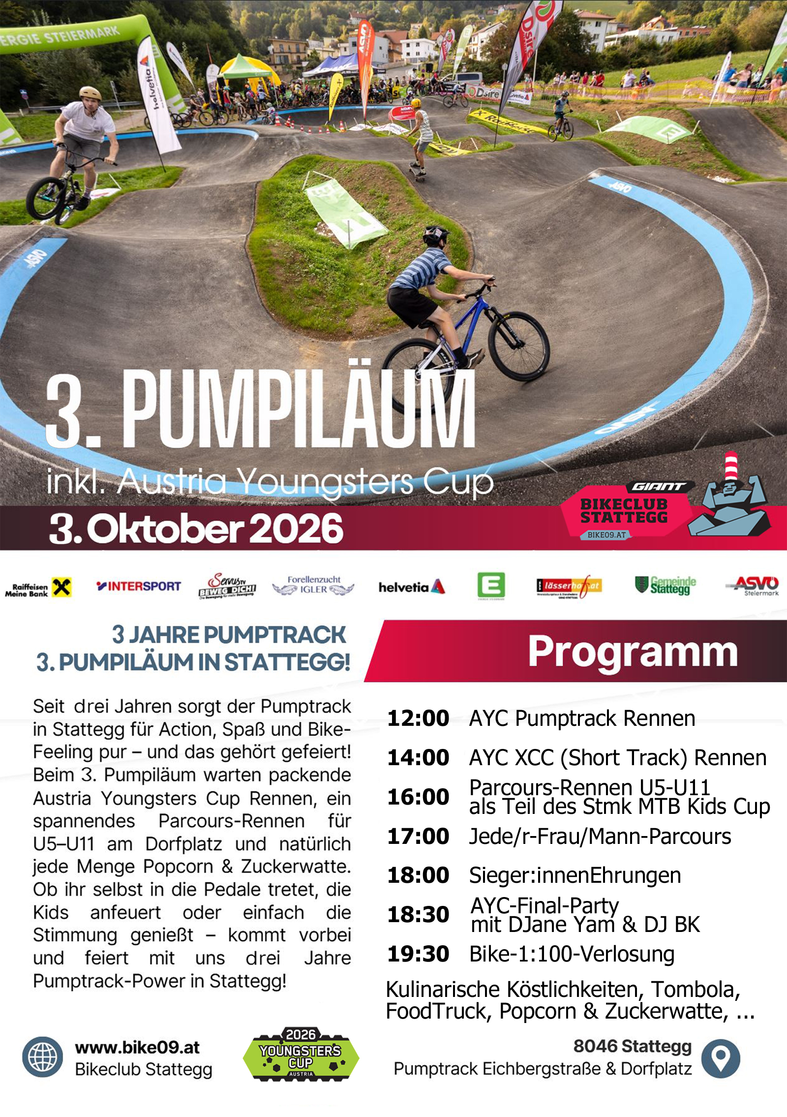 Samstag - 03.10.2026 12:00 - ca. 13:30 AYC - Pumptrack Streckenbesichtigung nach eigenem Ermessen 14:00 - ca. 15:30 AYC XCC (Short Track) Streckenbesichtigung nach eigenem Ermessen 16:00 STMKids Cup Parcours-Race U5-U11, Dorfplatz; 17:00 FUN-Parcours-Race U13-U99 Dorfplatz; ~18:00 Siegerehrungen Danach: AFTER RACE - AYC-Saisonfinal-PARTY featuring DJane Yam & DJ BK im Festzelt am Dorfplatz von und zu Stattegg 19:30 Bike-Verlosung € 30,-/1:100 Chance |