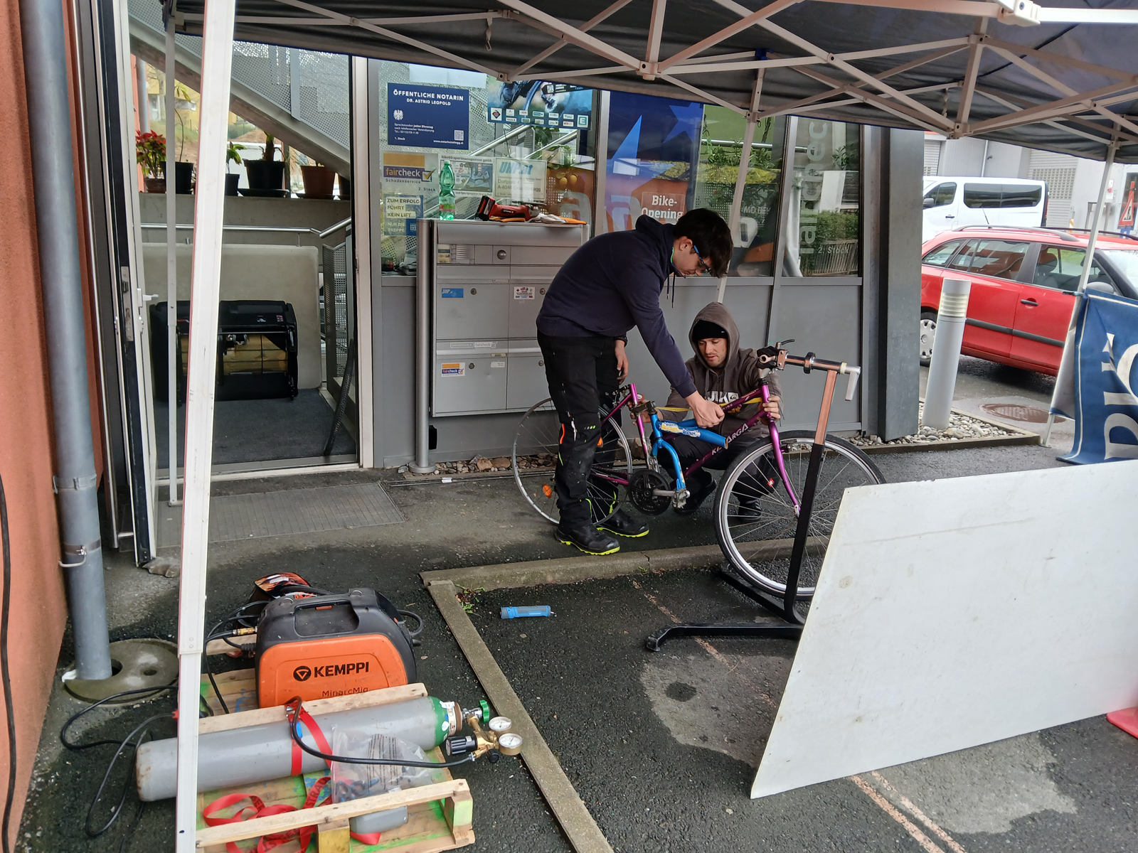 Um Absperr-Gitter, Erdspieße, Mini-Bikes und Co. reparieren zu können haben Flo und Geri extra einen beinharten Schweißkurs beim GasGasStef belegt und die Abschlussprüfung mit "Geradeso"-Erfolg bestanden.